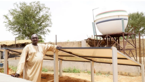 Boubacar Issoufou Alzouma se tient à côté des panneaux solaires. Le système de pompage...